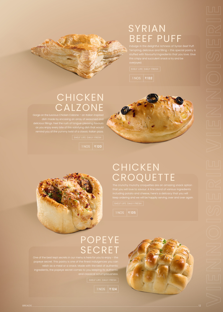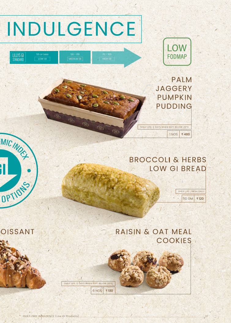 Indulgence features items like Broccoli & Herbs Low GI Bread and Raisin & Oat Meal Cookies, focusing on wholesome and specialty baked options.
