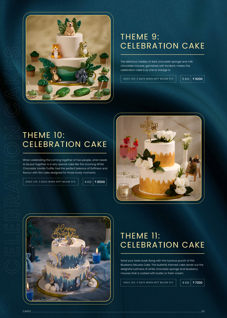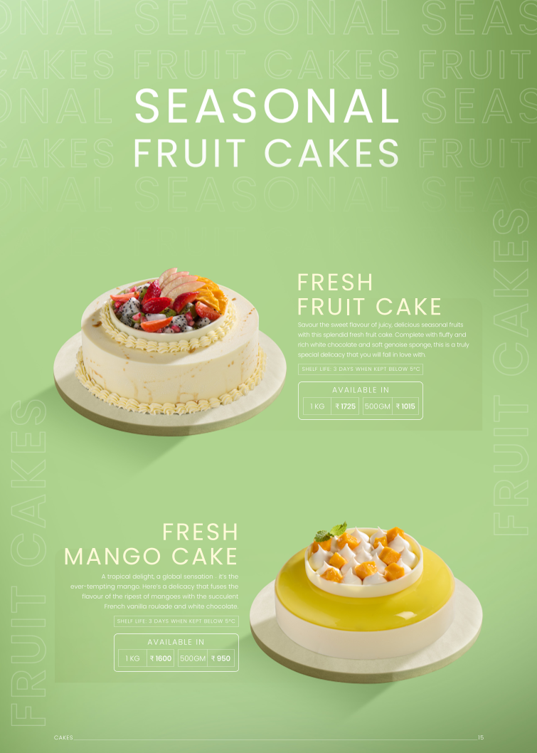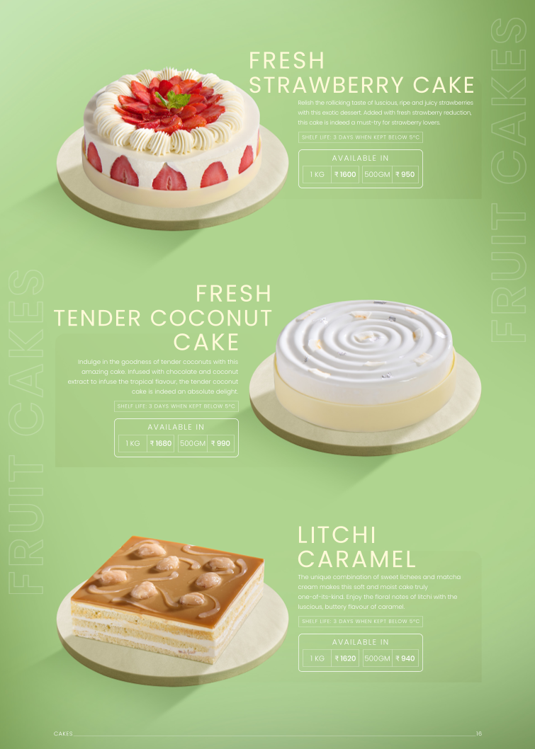 Others comprises a wider assortment of pastries and baked goods, including Cream Cheese Profit Roll, Fruit Tart, Fruit Salad, Tiramisu, Red Velvet Cream Cheese Cake, San Sebastine Cheese Cake, Fresh Strawberry Cake, Fresh Tender Coconut Cake, Litchi Caramel, Healthy Loaf, Wheat Bread, Milk Bread, and Focaccia. Prices for some items, such as Milk Bread, are indicated (₹85.00).