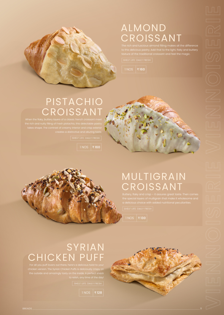 The menu supports casual dining and quick orders, making it suitable for customers looking to enjoy freshly baked pastries alongside a selection of coffees and light snacks.